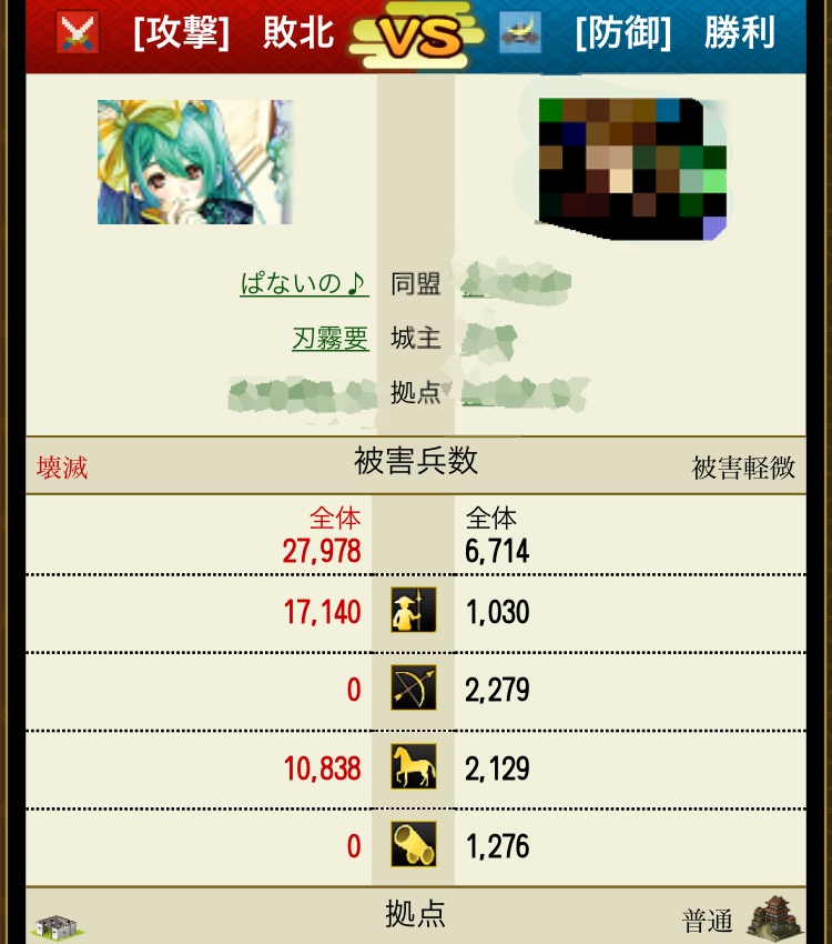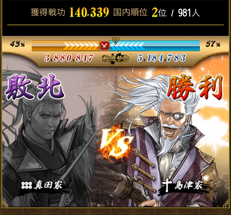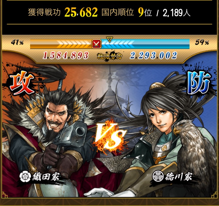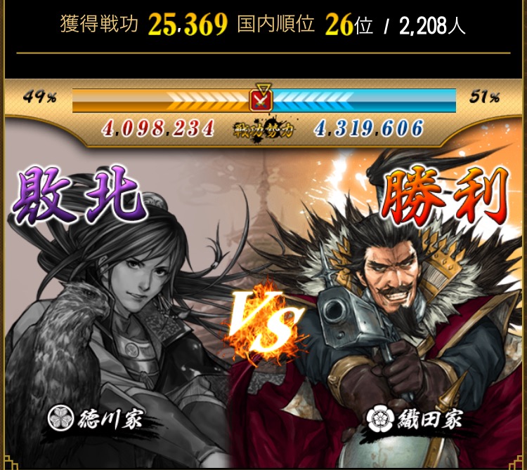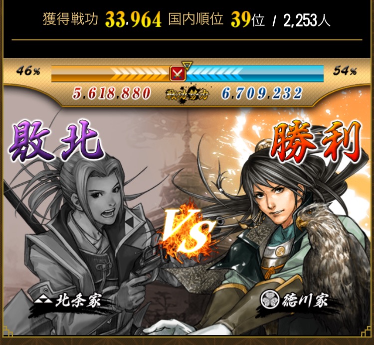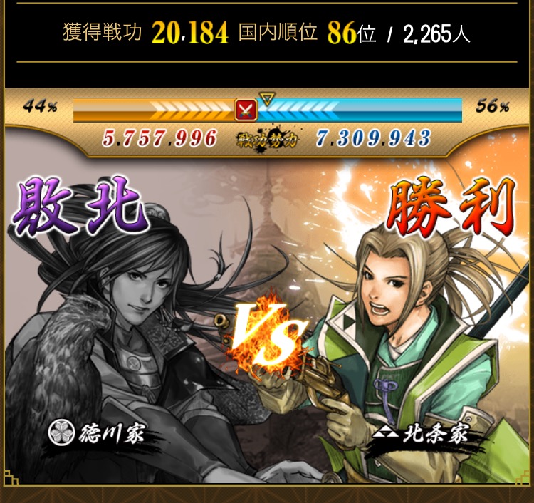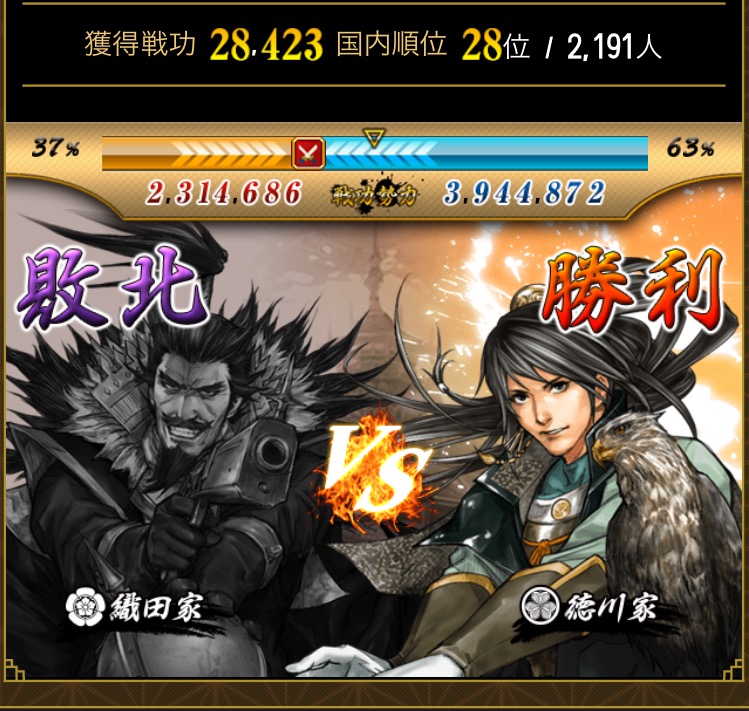 負けました。序盤は勝ってたんですがやはりこの時期は出城陥落の方が獲得戦功が多いこと、また盟主戦も下手すると与戦功の方が大きいことなどあるため、攻撃戦で勝つのは難しい…