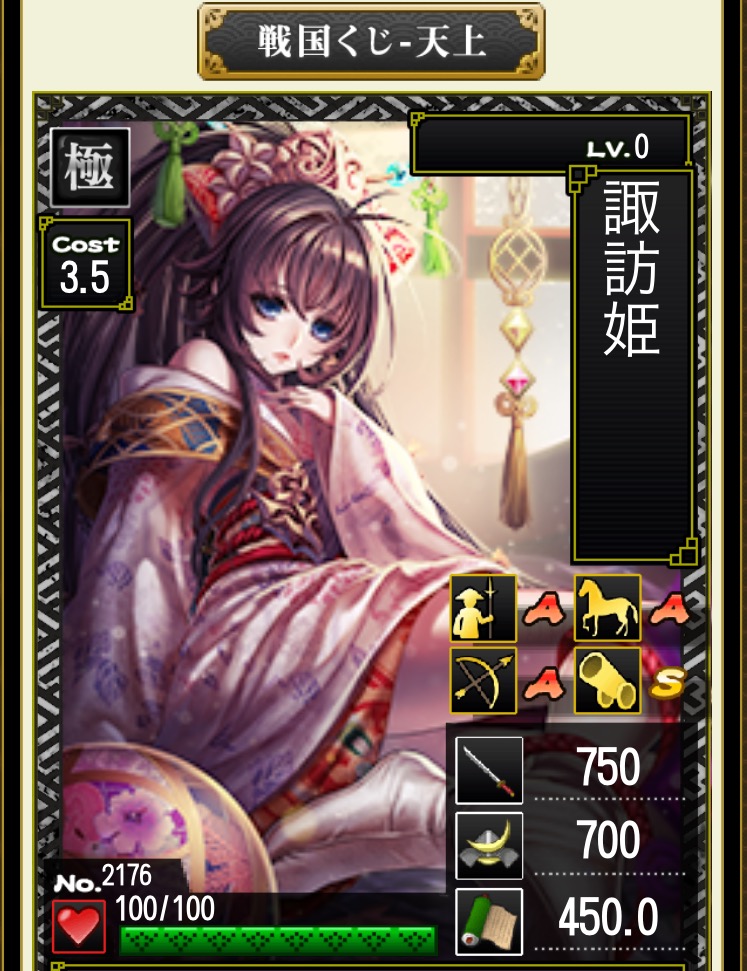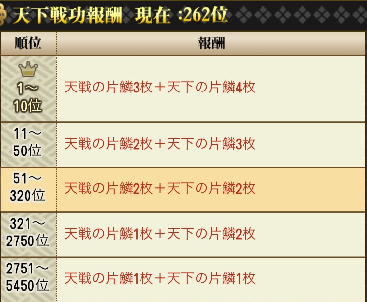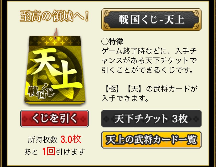 嬉しいことに天戦くじの配布に繋がる天下戦功の順位が変わったおかげで2枚ゲトぉ